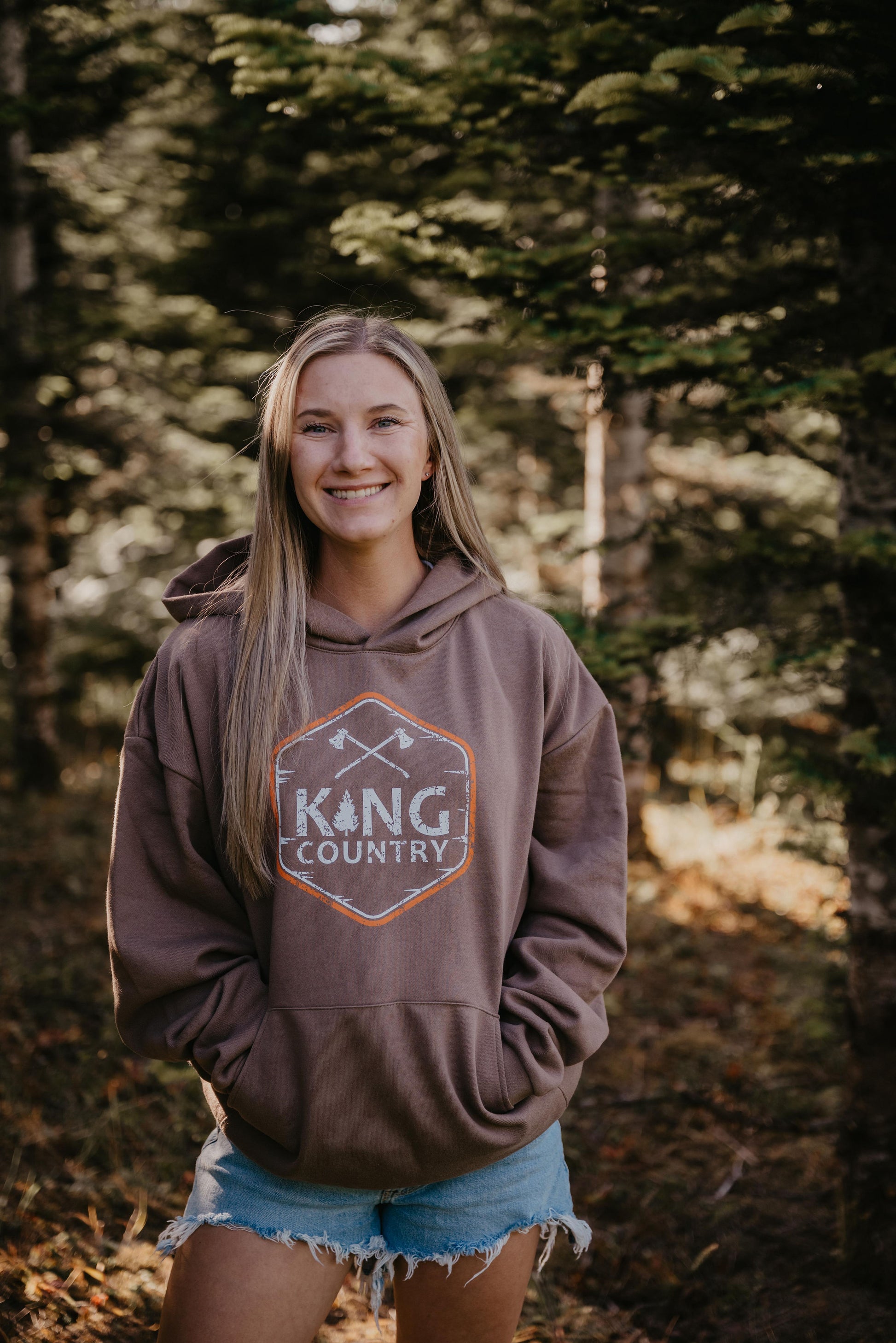 Clay brown hoodie color with an orange and white logo. Slightly oversized.
